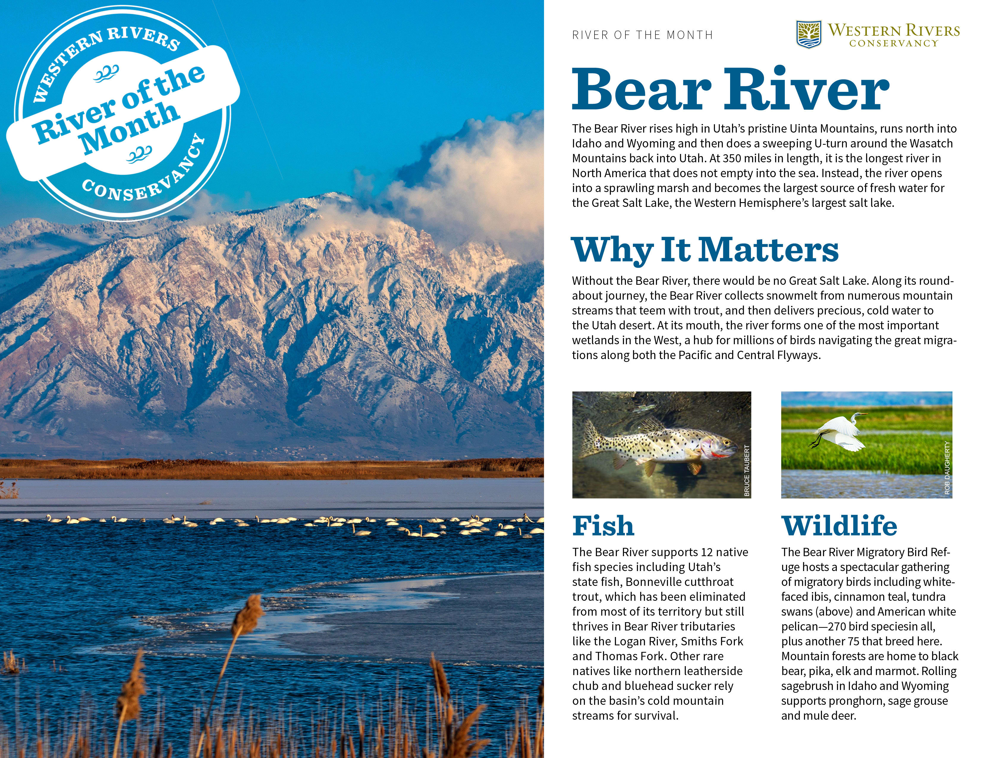 The Bear River supports 12 native fish species including Utah’s state fish, Bonneville cutthroat trout, which has been eliminated from most of its territory but still thrives in Bear River tributaries like the Logan River, Smiths Fork and Thomas Fork. Other rare natives like northern leatherside chub and bluehead sucker rely on the basin’s cold mountain streams for survival.