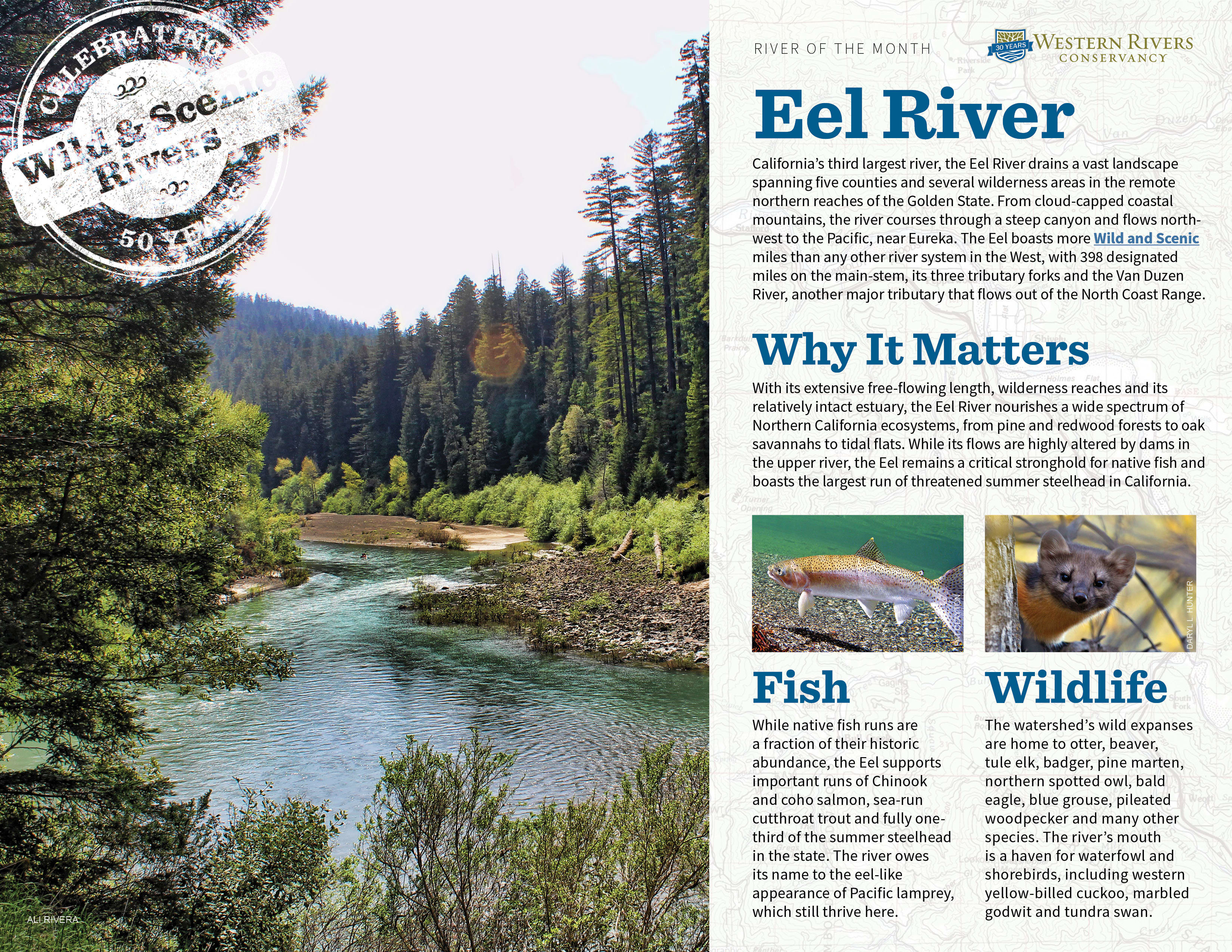 The watershed’s wild expanses are home to otter, beaver, tule elk, badger, pine marten, northern spotted owl, bald eagle, blue grouse, pileated woodpecker and many other species. The river’s mouth is a haven for waterfowl and shorebirds, including western yellow-billed cuckoo, marbled godwit and tundra swan.