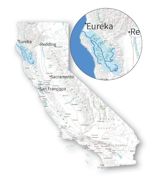 While native fish runs are a fraction of their historic abundance, the Eel supports important runs of Chinook and coho salmon, sea-run cutthroat trout and fully one-third of the summer steelhead in the state. The river owes its name to the eel-like appearance of Pacific lamprey, which still thrive here.