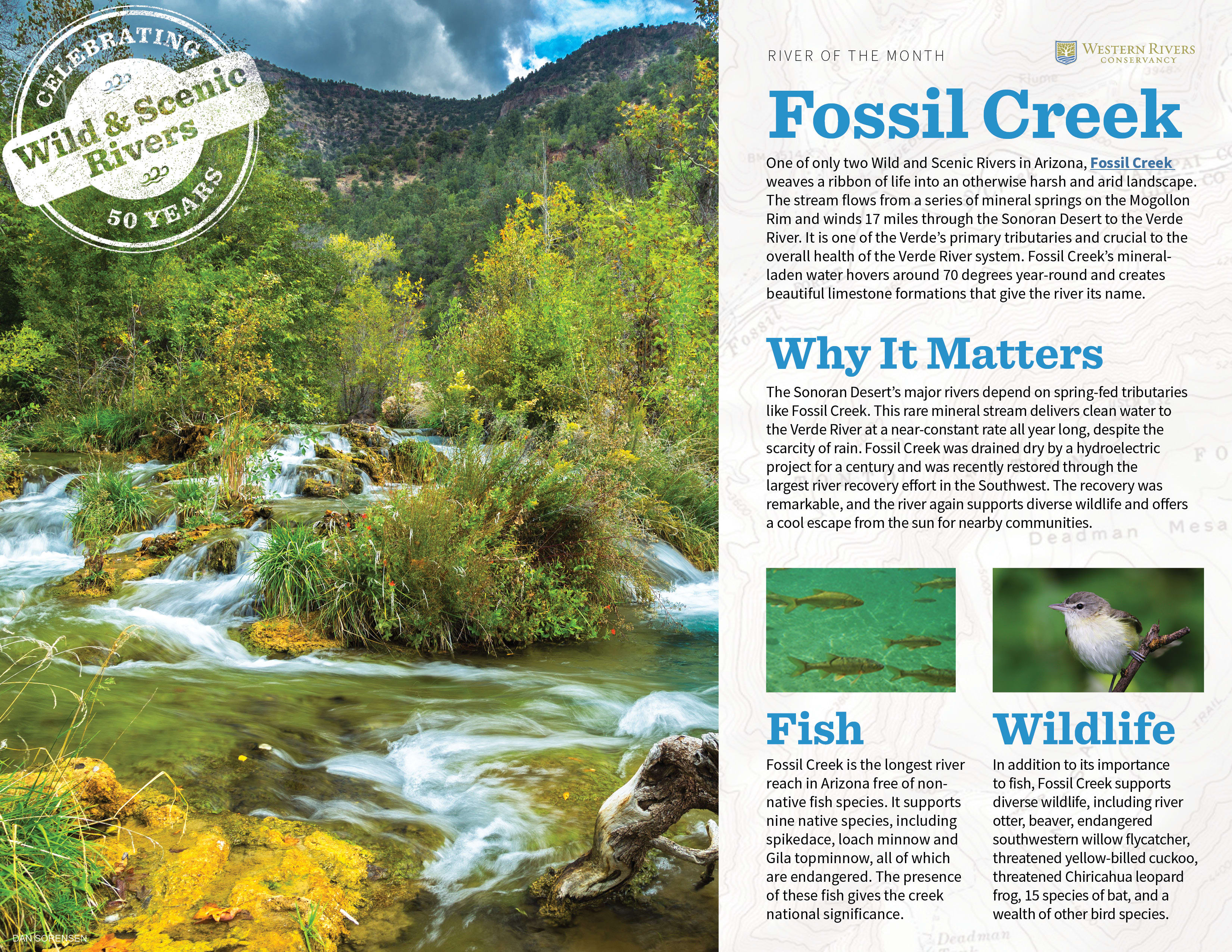 In 2016, WRC conserved the last unprotected parcel of land within the Fossil Creek Wild and Scenic River corridor by acquiring a 19-acre property and conveying it to the Coconino National Forest for permanent protection. WRC’s acquisition of these lands helped strike a balance between conservation and recreation within the corridor and will improve the Forest Service’s ability to manage recreation along the river. Our efforts build on 12 years of conservation and restoration work by state and federal agencies and restoration groups.