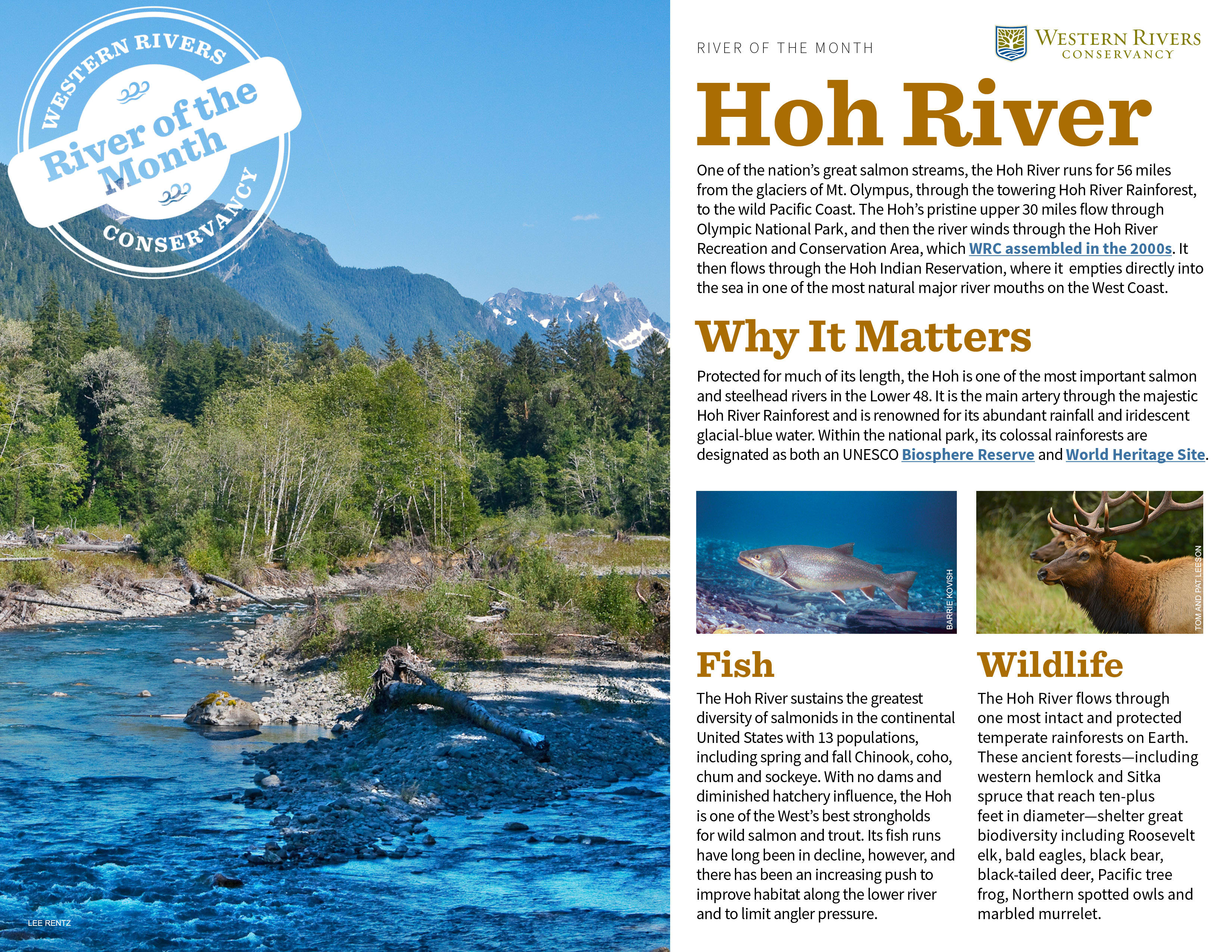 To ensure the Hoh River was permanently protected from source to sea, Western Rivers Conservancy undertook a nine-year initiative to purchase nearly all industrial forest lands along the lower river corridor, which were then managed primarily as a tree farm. Piece by piece, we purchased nearly 7,000 acres along 30 miles of the river. We then partnered with Wild Salmon Center to create the Hoh River Trust to manage the new Hoh River Recreation and Conservation Area for the sake of fish, wildlife and people. In 2017, we worked with the trust to transfer the lands to The Nature Conservancy, ensuring they remain protected and open, free of charge, for the public to hike, fish, hunt, boat and otherwise enjoy. With the upper river protected within Olympic National Park, nearly the entire length of the Hoh River is now conserved—a critical gain for a globally significant stronghold for salmon, steelhead and wildlife.