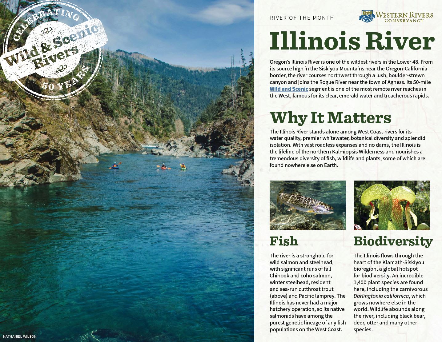 The river is a stronghold for wild salmon and steelhead, with significant runs of fall Chinook and coho salmon, winter steelhead, resident and sea-run cutthroat trout (above) and Pacific lamprey. The Illinois has never had a major hatchery operation, so its native salmonids have among the purest genetic lineage of any fish populations on the West Coast.