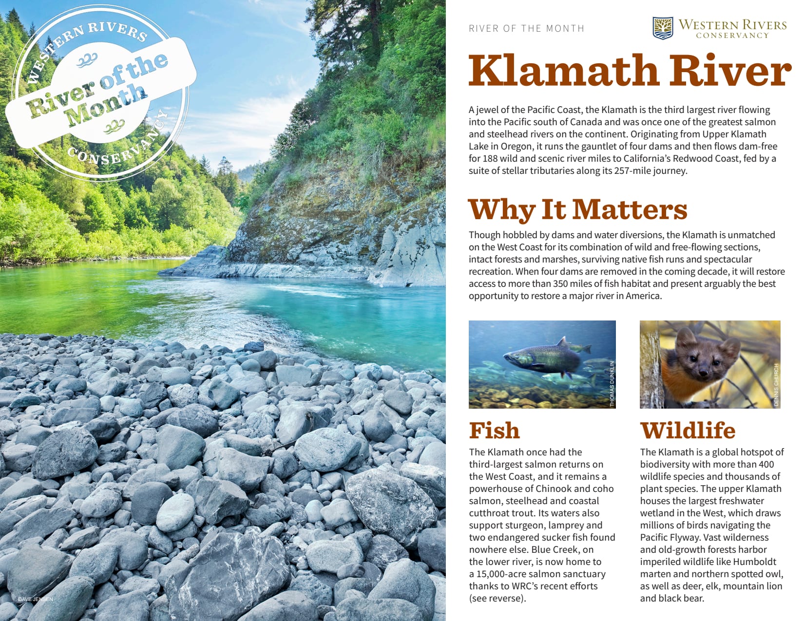 The Klamath once had the third-largest salmon returns on the West Coast, and it remains a powerhouse of Chinook and coho salmon, steelhead and coastal cutthroat trout. Its waters also support sturgeon, lamprey and two endangered sucker fish found nowhere else. Blue Creek, on the lower river, is now home to a 15,000-acre salmon sanctuary thanks to WRC’s recent efforts (see reverse).