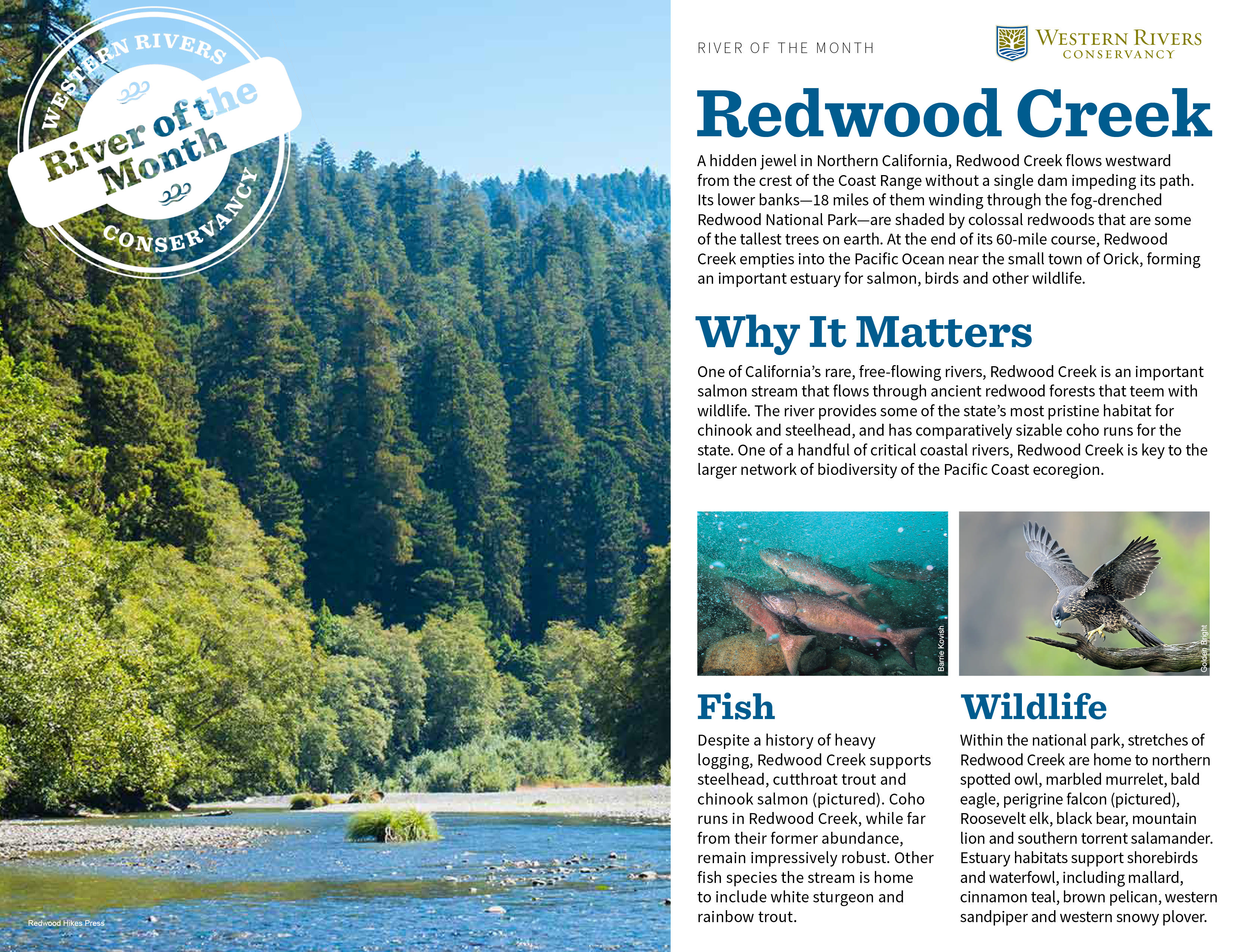 Like most streams of the Northern California coast, Redwood Creek supports Chinook (pictured) and coho salmon, steelhead and cutthroat trout. Coho returns, while far from their former abundance, remain relatively robust. The stream is also home to white sturgeon and resident rainbow trout.