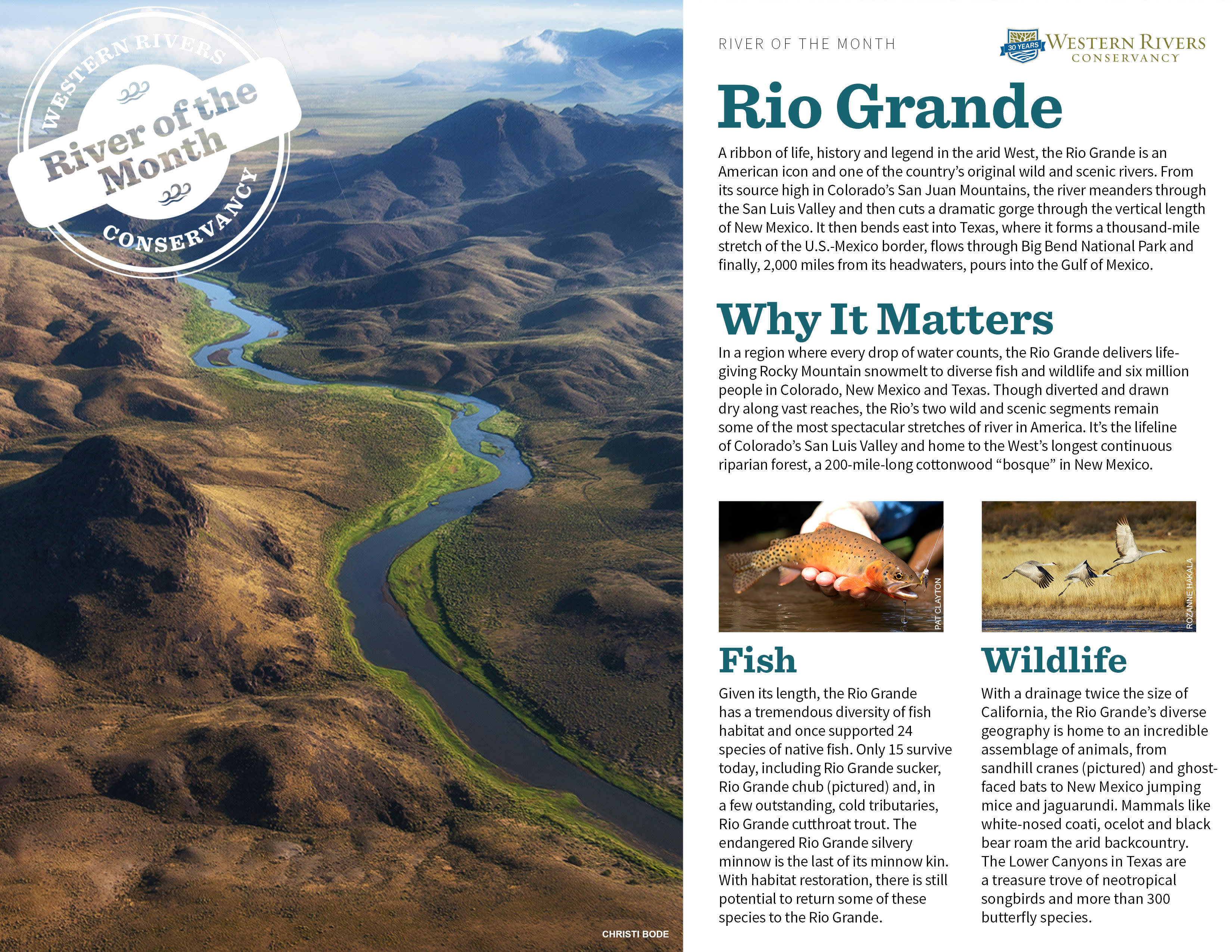 At its source, the Rio Grande winds through the high San Luis Valley in Colorado, sustaining incredible bird life, diverse wildlife and long-standing family farms and ranches. The area has been the focus of WRC’s efforts on the Rio Grande, where we are protecting vital habitat along the river and its top tributaries. As a result, new parks and protected areas now ensure a more hopeful future for fish and wildlife and connect people to the valley’s rivers and streams.