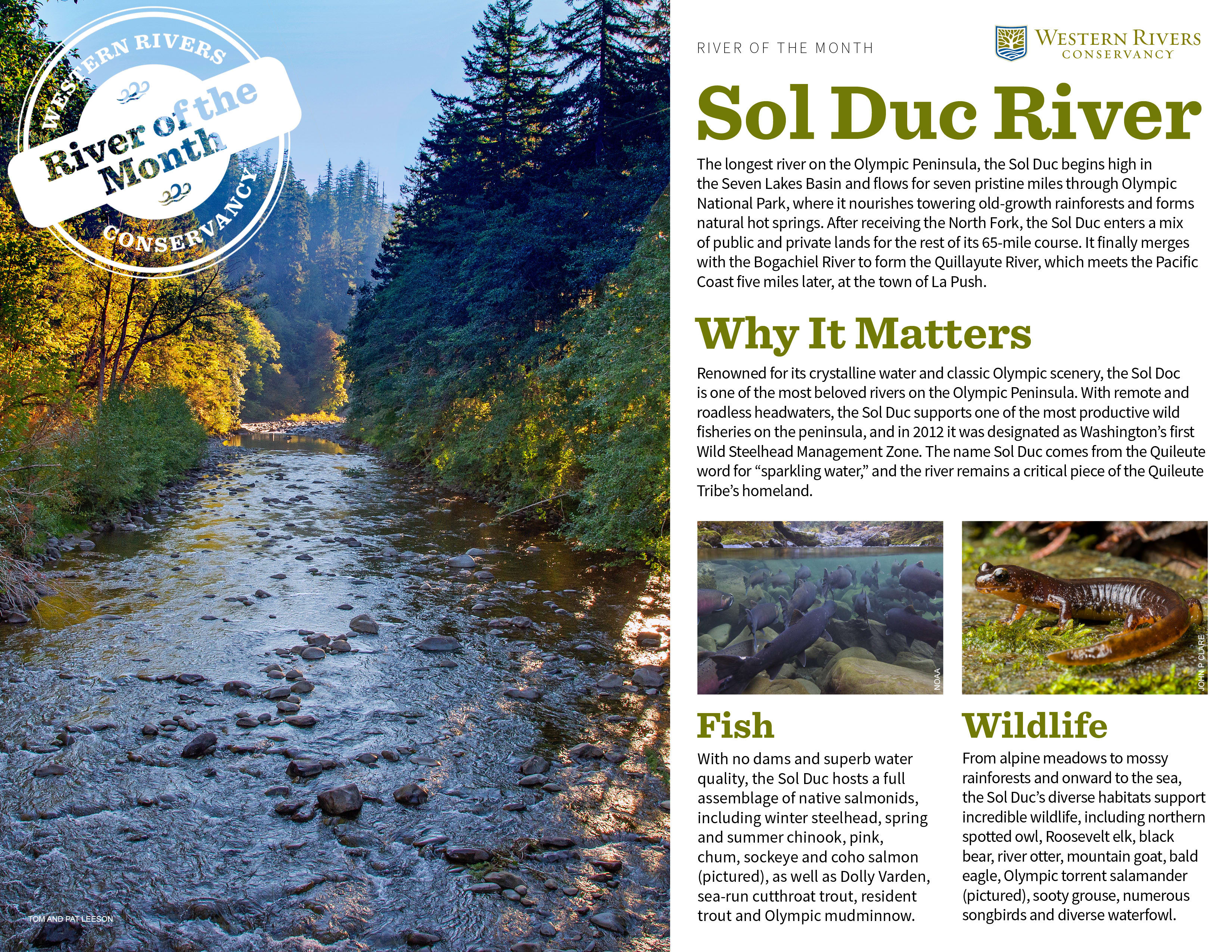 With no dams and superb water quality, the Sol Duc hosts a full assemblage of native salmonids, including winter steelhead, spring and summer chinook, pink, chum, sockeye and coho salmon (pictured), as well as Dolly Varden, sea-run cutthroat trout, resident trout and Olympic mudminnow.