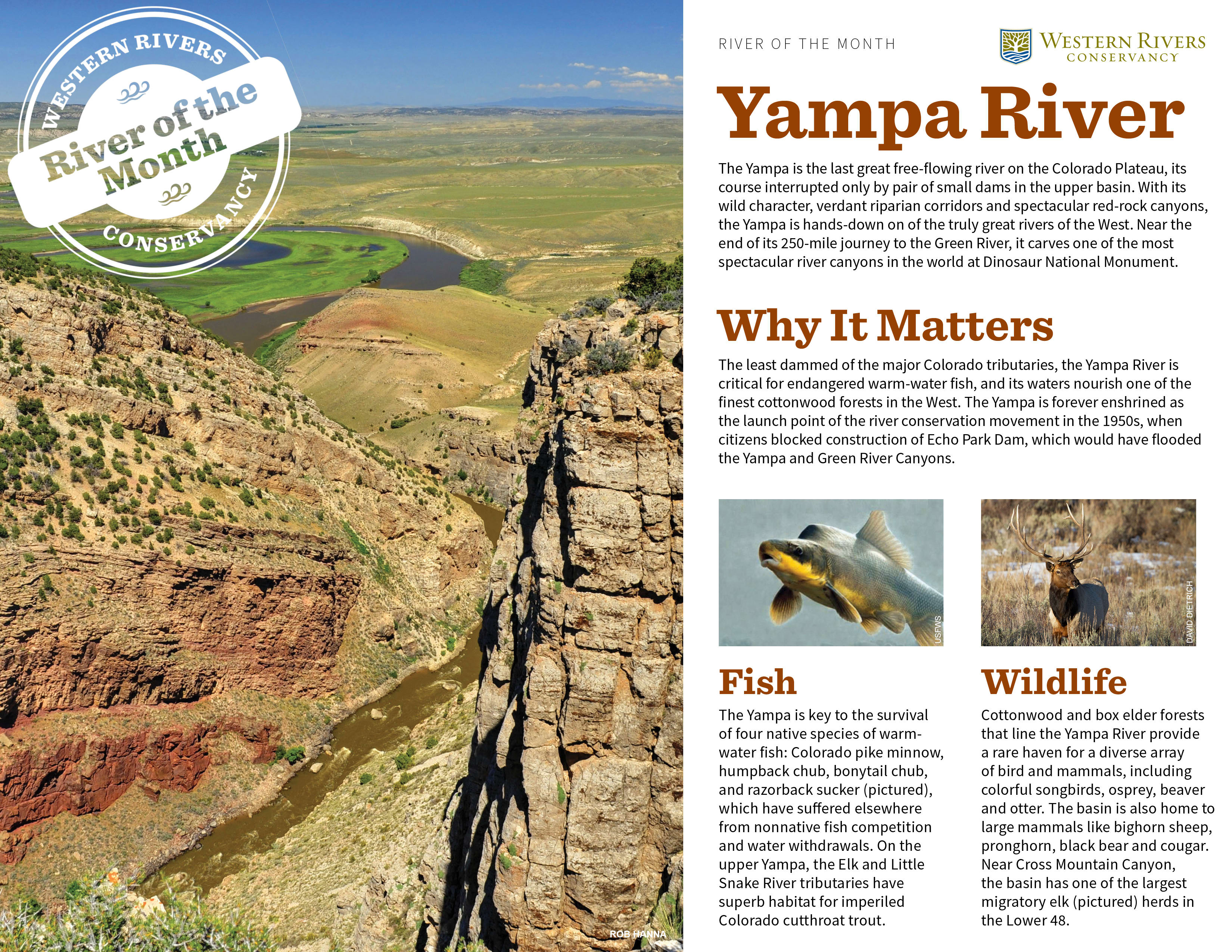 The Yampa is key to the survival of four native species of warm-water fish: Colorado pikeminnow, humpback chub, bonytail chub, and razorback sucker (pictured), which have suffered elsewhere from nonnative fish competition and habitat degradation. The upper Yampa, the Elk and Little Snake River tributaries have superb habitat for imperiled Colorado cutthroat trout.